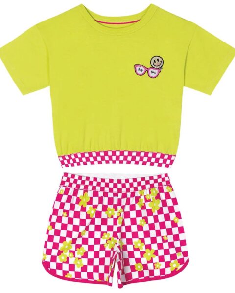 Conjunto Blusa Verde Claro/ Xadrez Pink e Branco